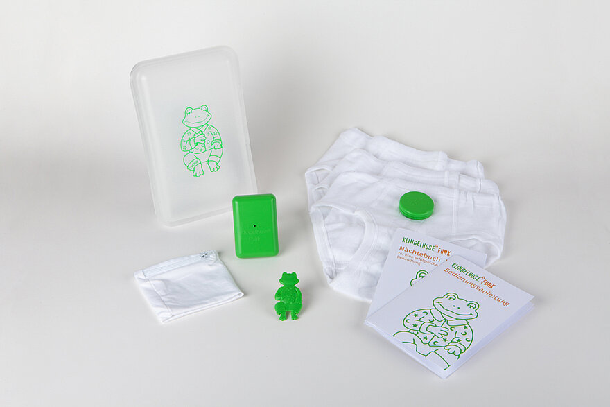 - Der große Feuchtigkeitsfühler in der Unterhose gewährt ein schnelles Auslösen des Wecksignals. Dadurch wird erreicht, dass das Kind bei Harndrang sofort geweckt wird, was zu einem rascheren Behandlungserfolg führt.