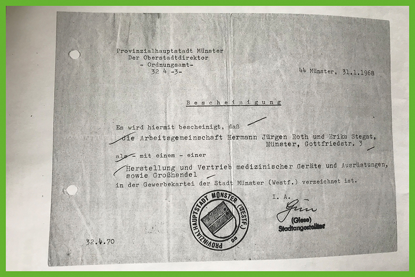 Startschuss für die Klingelhose®: Erika und Harry Stegat gründen mit Dr. Jörn Roth ein Unternehmen für Herstellung und Vertrieb medizinischer Geräte und Ausrüstungen in Münster. Als Psychologe arbeitet Harry Stegat schon länger an einem Alarmsystem gegen das Bettnässen.