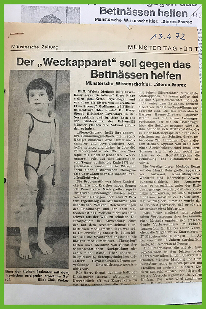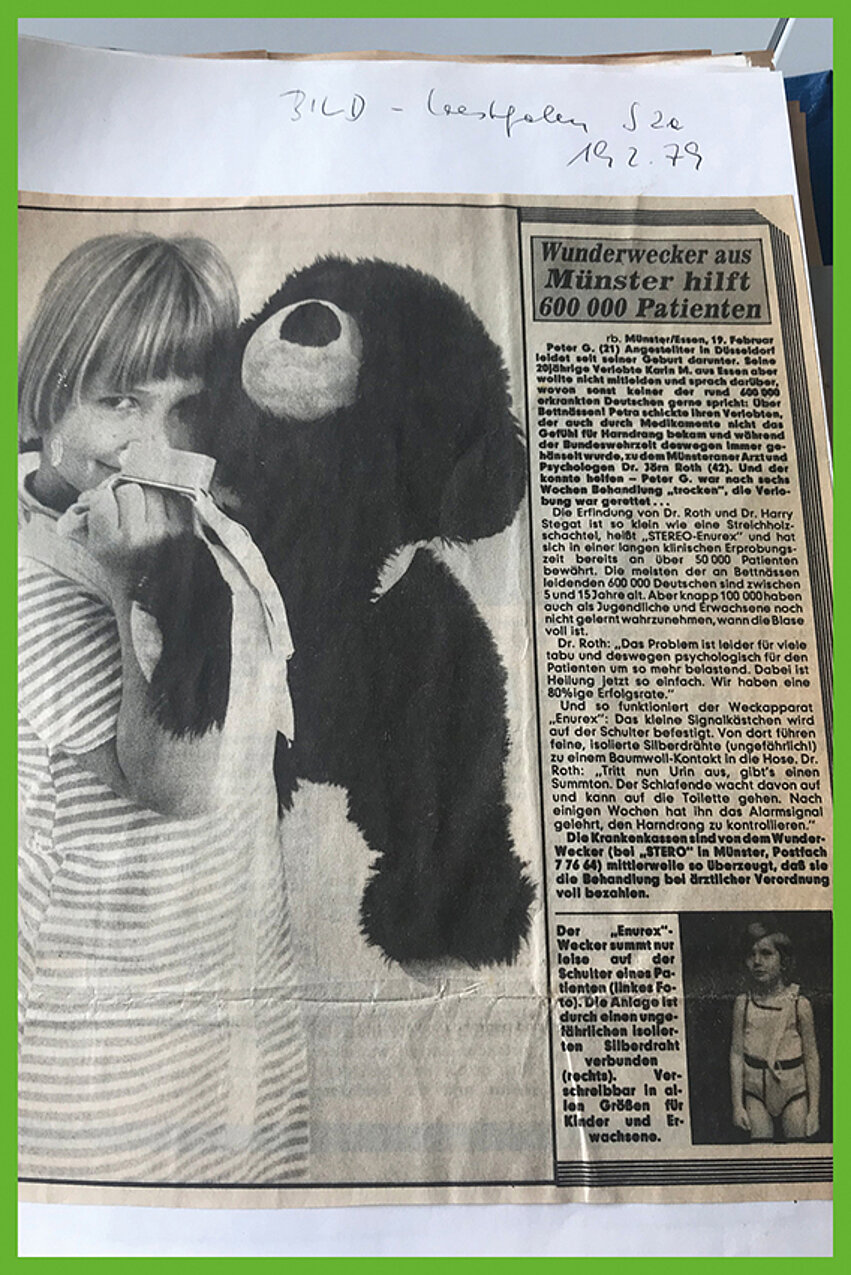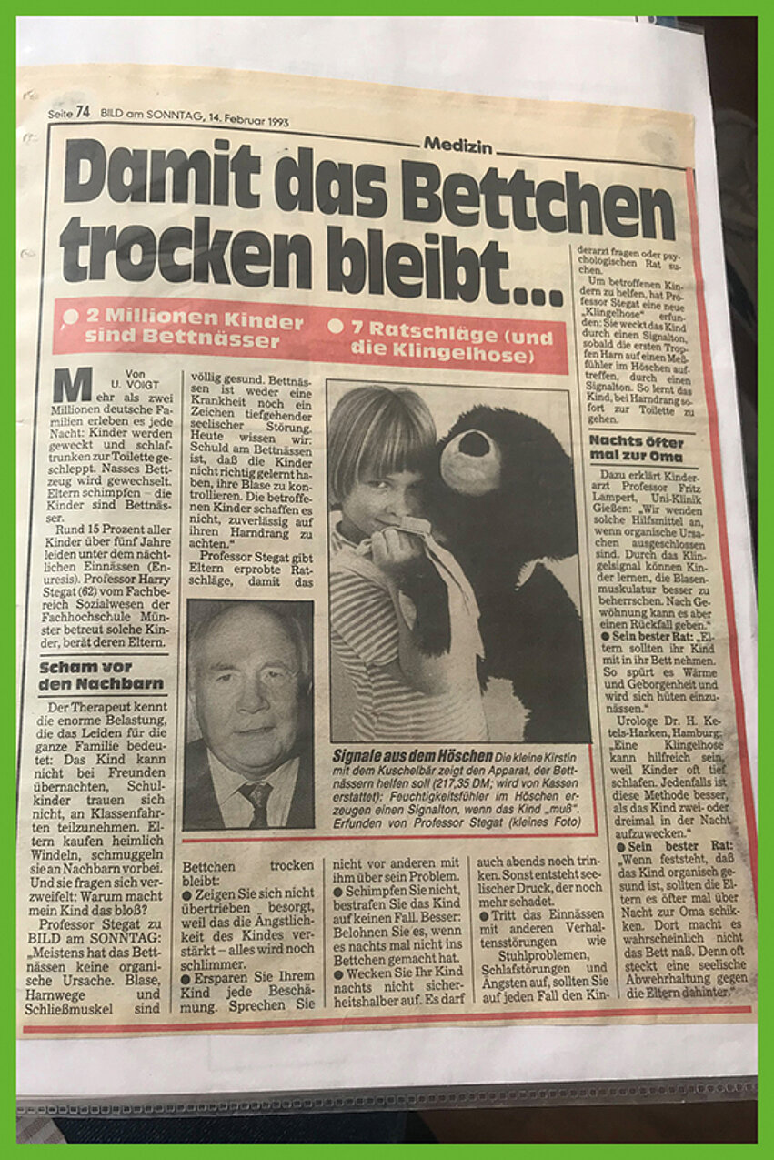 Als Psychologe und Kinderarzt haben sich Stegat und Roth intensiv mit dem Thema Bettnässen befasst. 1963 entwickelten sie einen ersten Apparat für die Therapie. Dieses Urmodell der Klingelhose® funktionierte im Prinzip genauso wie heute – Es wurde im Laufe der Jahre immer weiter optimiert und an moderne Entwicklungen angepasst. So wurde die Klingelhose immer kleiner, feiner, komfortabler ... Ihr Anspruch aber ist bis heute der gleiche geblieben: es Kindern leicht zu machen, nachts trocken zu werden. Wissenschaftlich fundiert, psychologisch begleitet und kindgerecht.