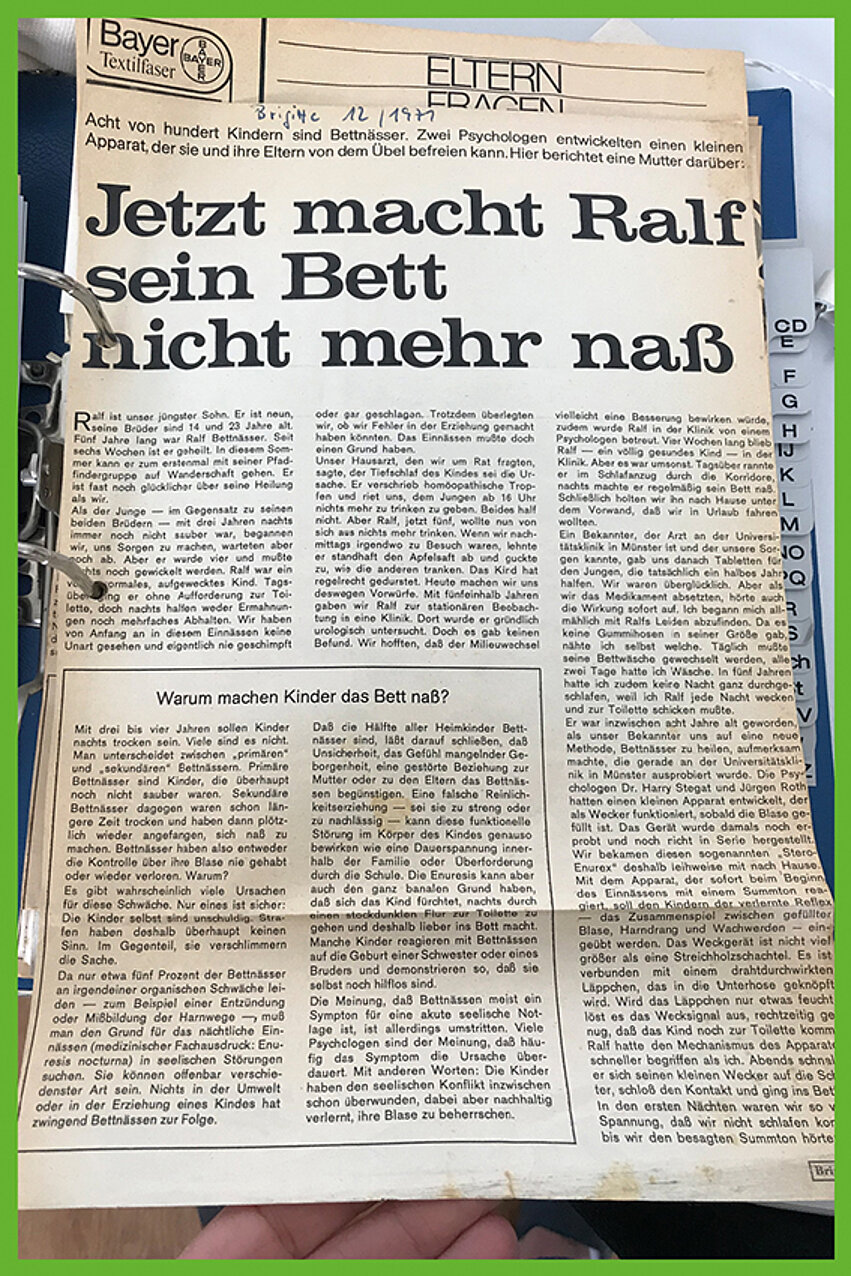 Unsere erste Klingelhose® kommt auf den Markt. Ein Artikel im Magazin "Brigitte" im folgenden Jahr beschert dem Tabuthema Bettnässen Aufmerksamkeit und verhilft der Klingelhose® zum Durchbruch.